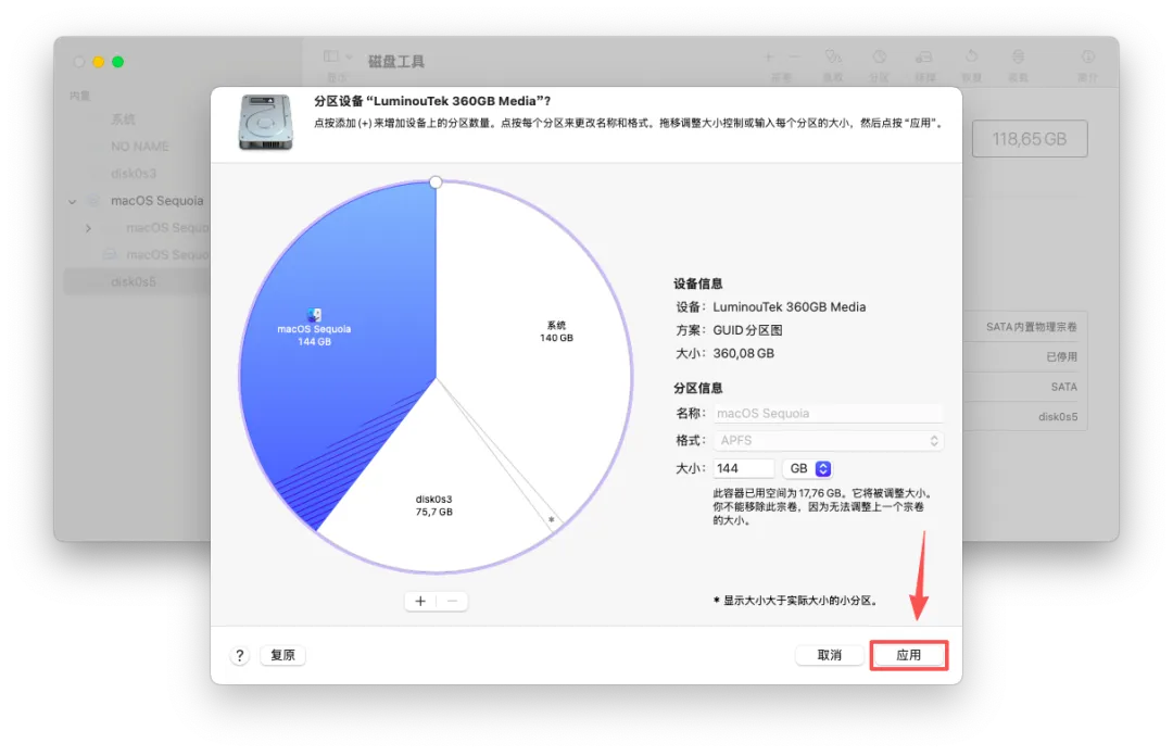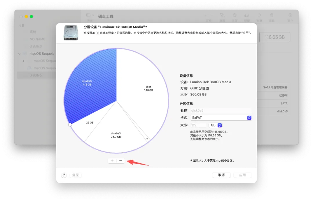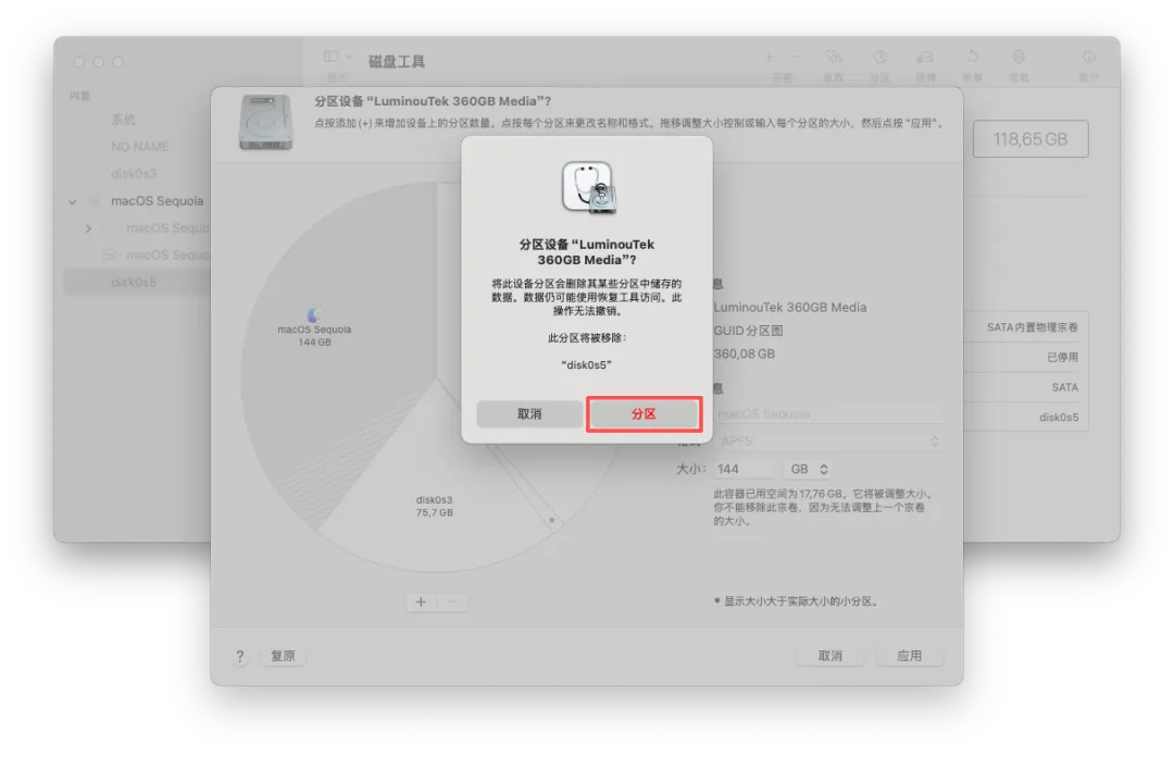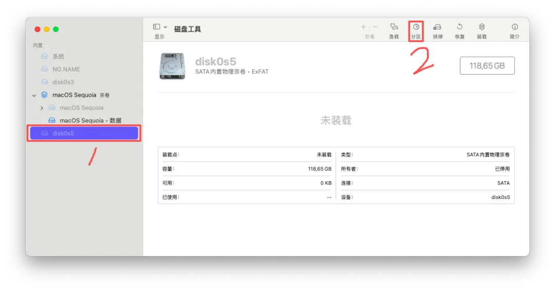 (61)选定 macOS Sequoia 系统下的 disk0s5(ExFAT 格式分区,通常在列表下方)→ 点击「分区」。