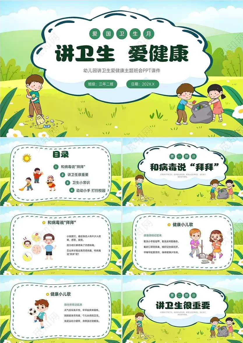 绿色卡通插画讲卫生爱健康主题班会PPT课件