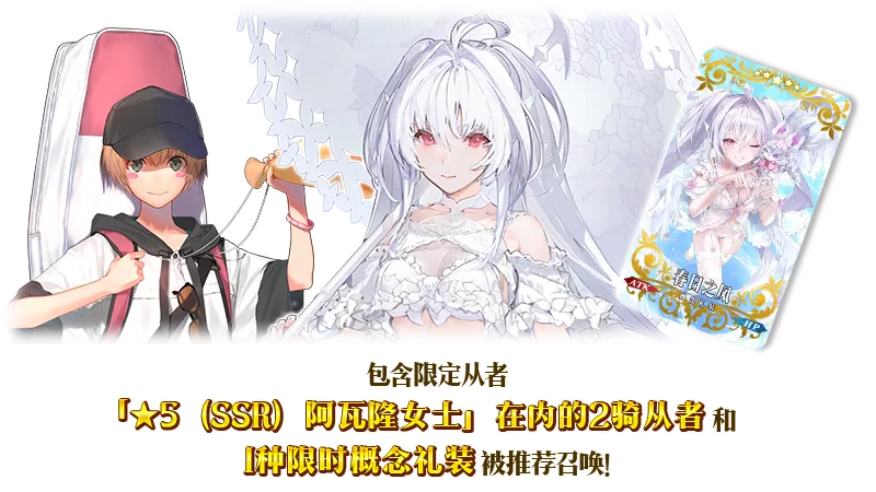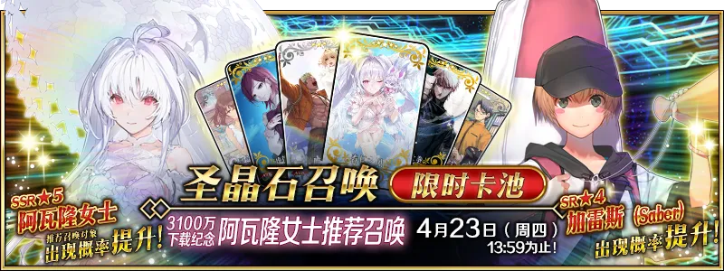 为了纪念3100万下载突破,包含限定从者「★5(SSR)阿瓦隆女士」在内的2骑从者和1种限时概念礼装被推荐召唤!