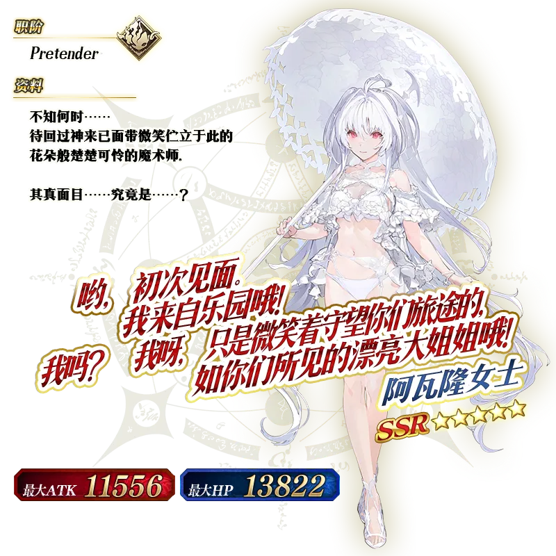 ※以上「★5(SSR)阿瓦隆女士」的立绘和圣肖像为灵基再临第2阶段。