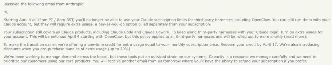2026 年 4 月 4 日中午 12 点,一封来自 Anthropic 的邮件打破了 AI 开发者社区的平静。邮件内容简洁而坚决:从即刻起,Claude Pro 和 Max 订阅用户将无法再通过 OpenClaw 等第三方工具使用其订阅额度,必须改用单独计费的“额外使用”(Extra Usage)选项,或直接购买 API 密钥按量付费。