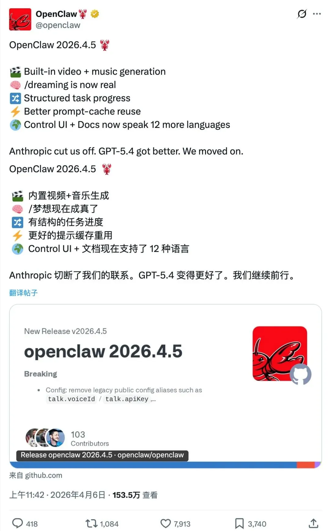 但真正的反击不是在社交媒体上,而是在代码仓库里。仅仅 48 小时后,2026 年 4 月 6 日,OpenClaw 2026.4.5 版本正式发布。官方推文用三句话完成了最强回应: