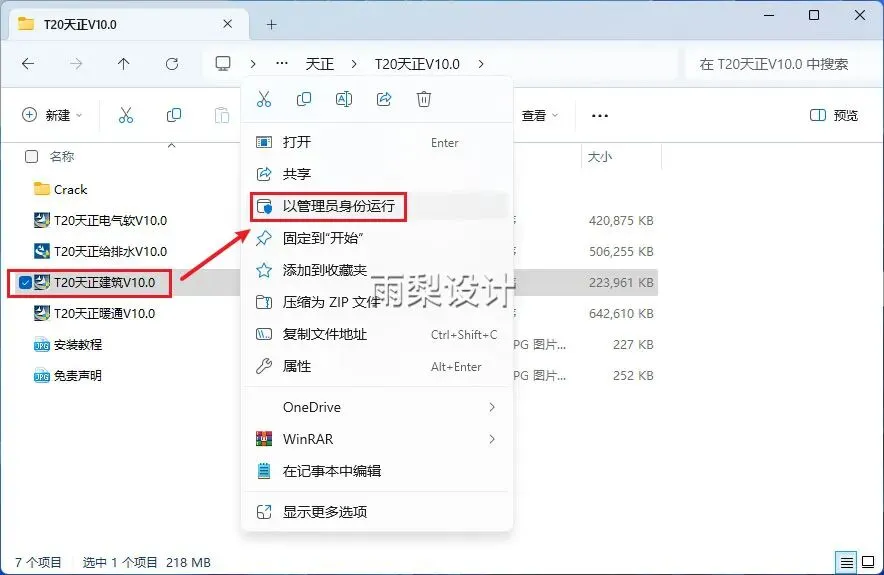 2.选择【T20天正建筑V10.0】右键选择【以管理员身份运行】(需要安装那款就选那款)