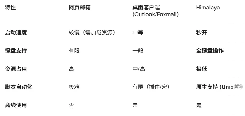 当大多数人还在鼠标点击中切换邮箱标签页时,有一群人早已在终端里用键盘完成了所有邮件操作。今天,我们来认识一位“邮件界的 Vim”——Himalaya。