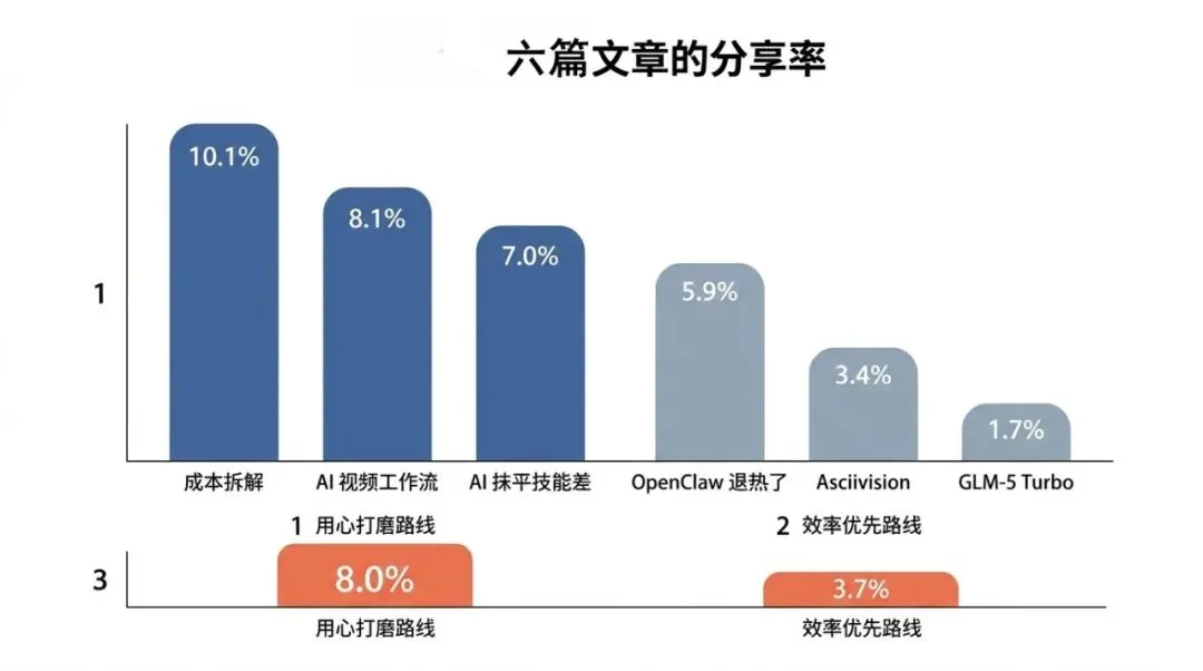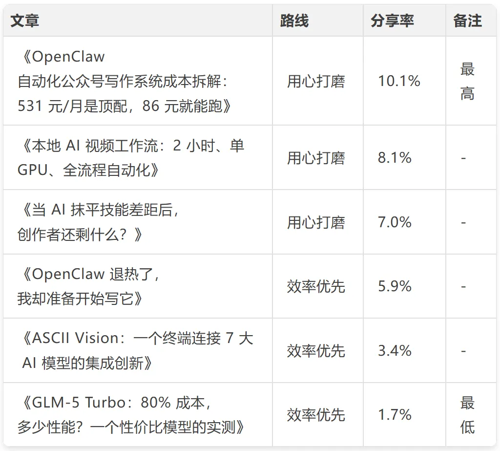 用心打磨路线的三篇文章,分享率都在 7% 以上。效率优先路线的三篇,从 1.7% 到 5.9% 不等。