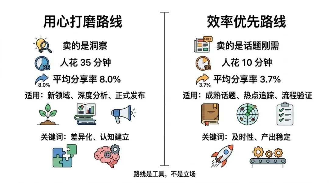 如果你的话题本身够硬(比如成本拆解、实操复盘),效率路线也能拿到不错的数据。如果你的话题需要教育读者(比如新概念、新工具),用心路线更稳妥。