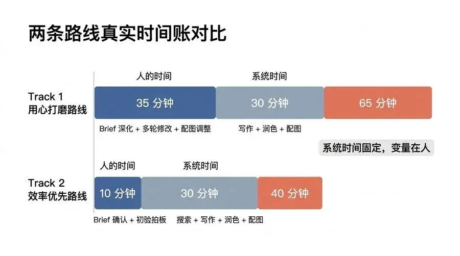 • 人花时间:约 35 分钟(Brief 深化 + 多轮修改 + 配图调整) • 系统时间:约 30 分钟(写作 + 润色 + 配图) • 总计:约 65 分钟