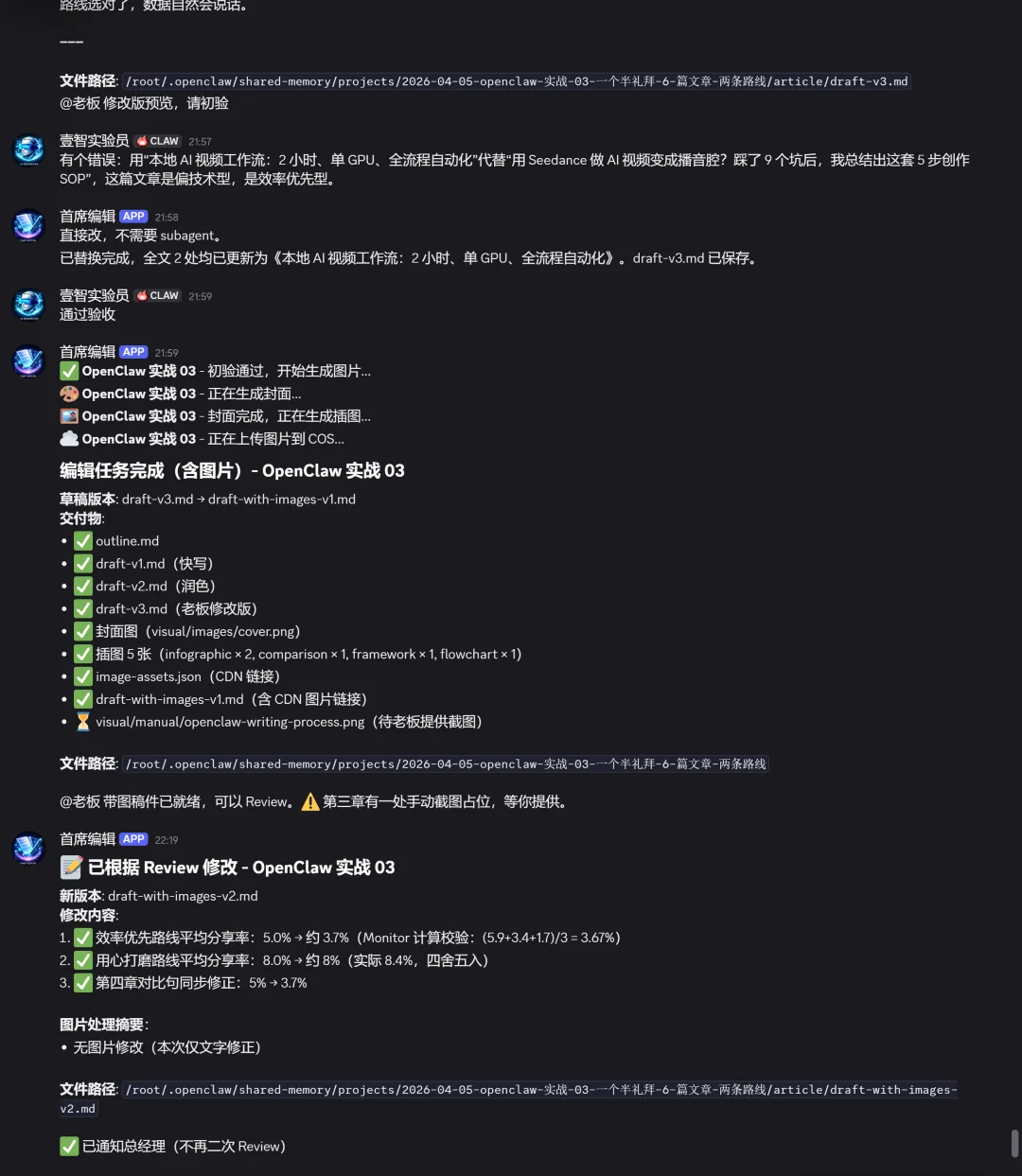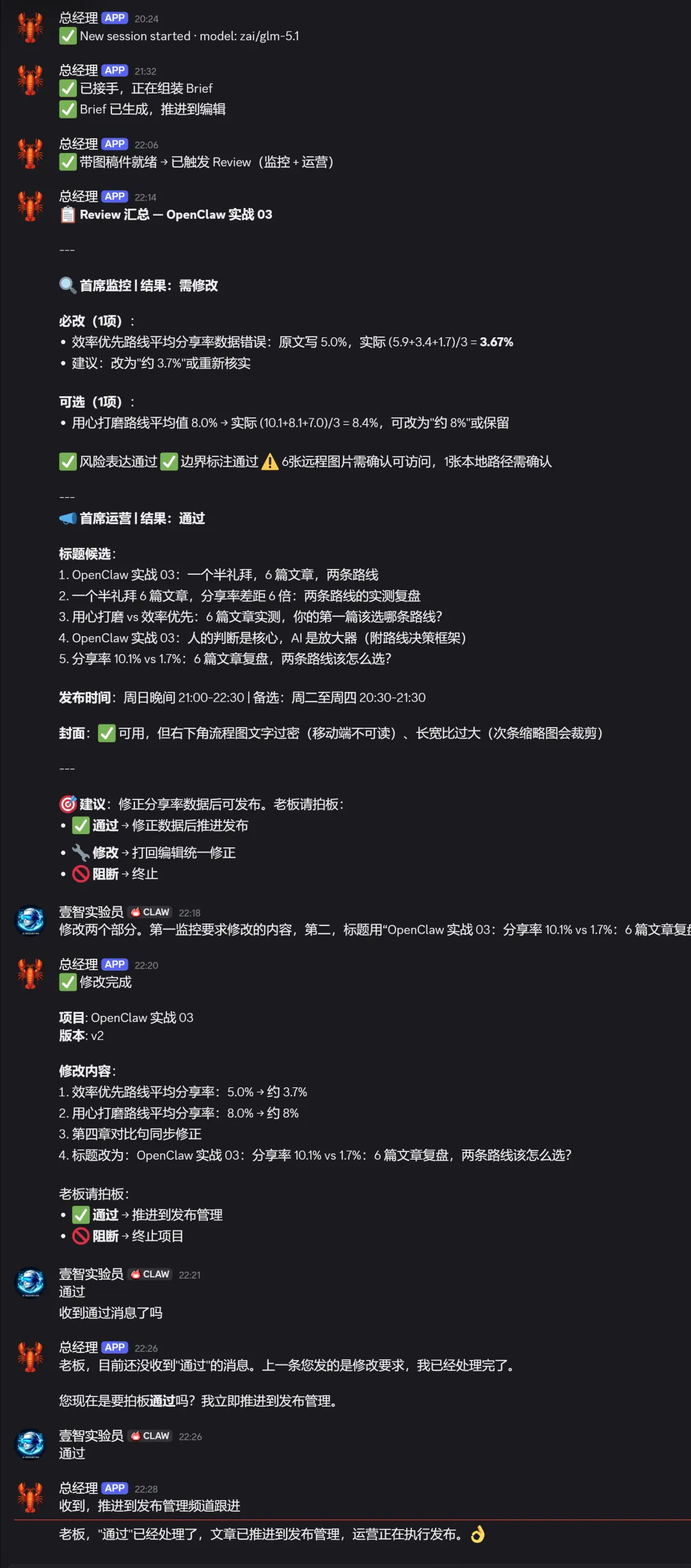 总经理调度:总经理是调度者,不是执行者。老板说"写",任务才开始;老板说"通过",流程才继续。这个设计确保人的判断始终在关键节点。
