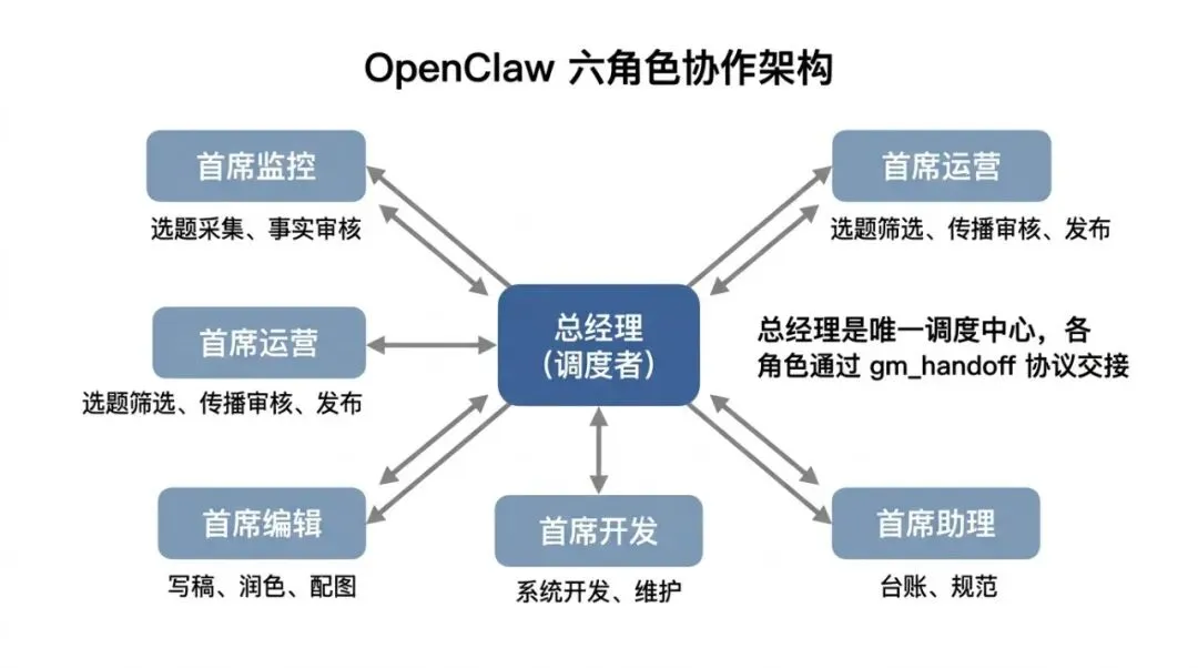 OpenClaw 有 6 个角色:总经理、首席监控、首席运营、首席编辑、首席开发、首席助理。