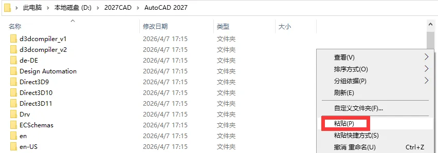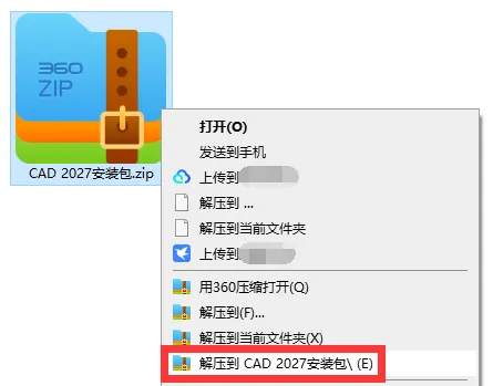 1、得到压缩包之后,鼠标右键解压,点击【解压到CAD 2027安装包】。