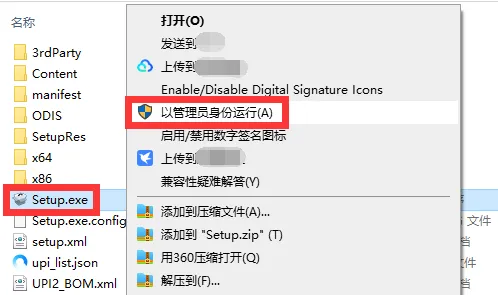 3、找到【Setup】程序文件,鼠标右键,选择【以管理员身份运行】。