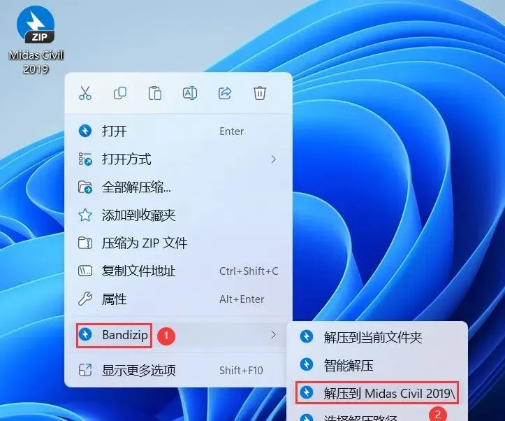 1、下载Midas Civil 2019软件安装包到电脑上,右键选择【解压到Midas Civil 2019\】