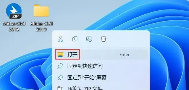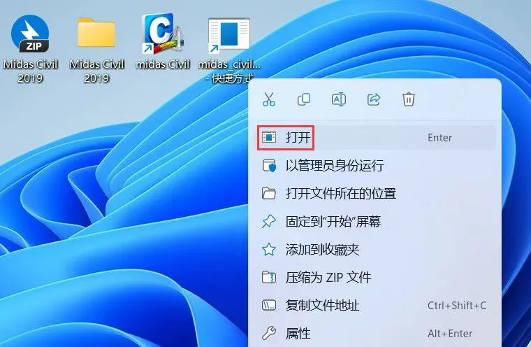 25、回到桌面,右键桌面上的【midas_civil_2019.1_crack快捷方式软件图标】,点击【打开】;注意:每次启动软件都要使用此快捷方式打开软件