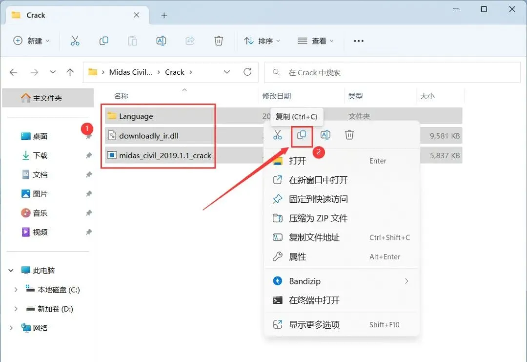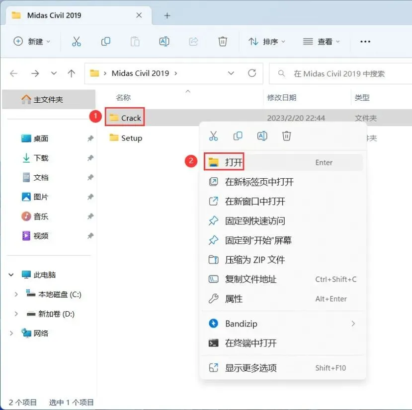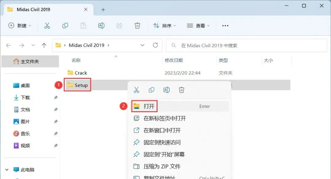 19、回到Midas Civil 2019文件夹,找到【Crack】文件夹,右键【打开】它