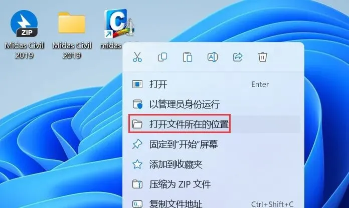 21、回到桌面,右键桌面上的【Midas Civil 2019软件图标】,点击【打开文件所在的位置】