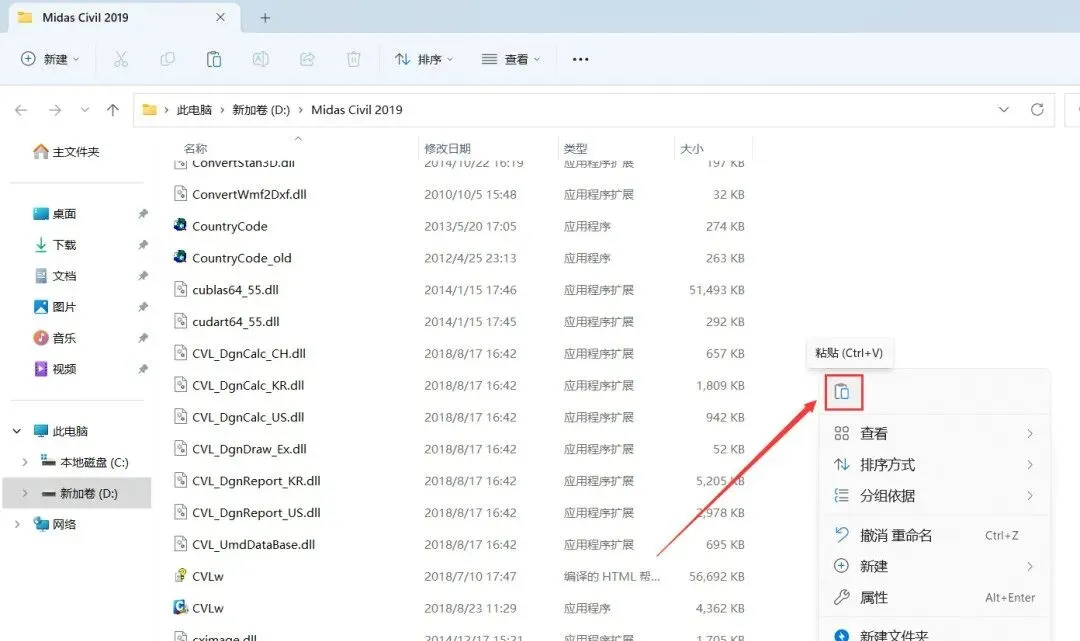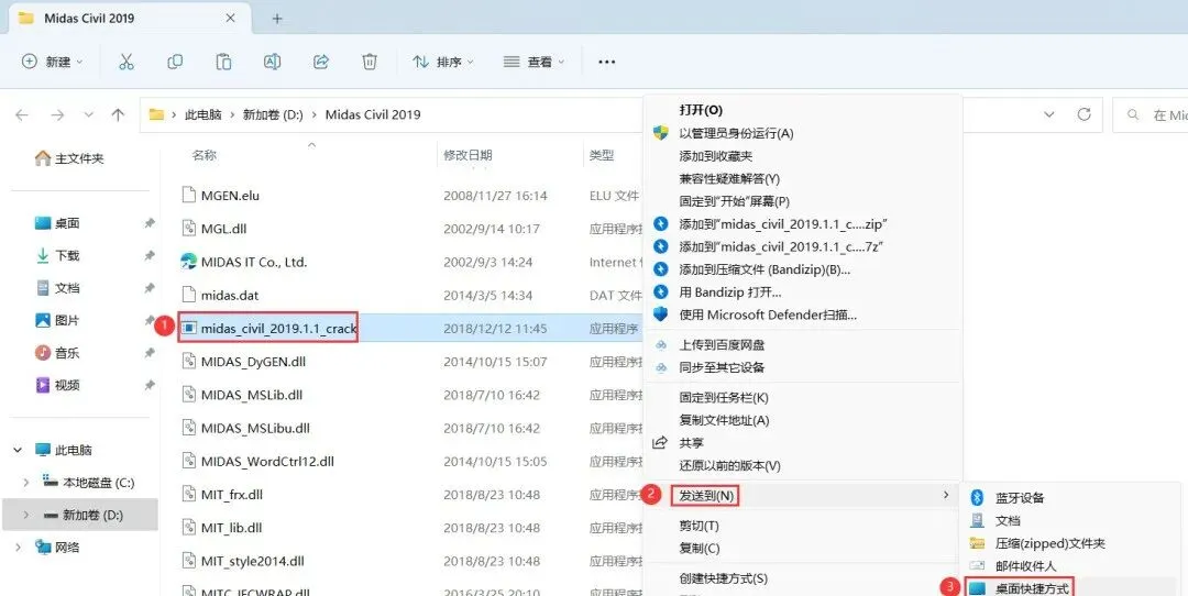 24、找到粘贴的【midas_civil_2019.1_crack】应用程序,依次点击【显示更多选项】、【发送到】、【桌面快捷方式】,完成软件桌面快捷方式的创建