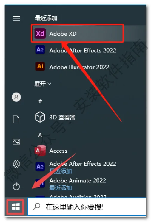 6.在桌面左下角的开始菜单中找到"Adobe XD"软件,鼠标左键拖拽到桌面上即可创建桌面快捷方式