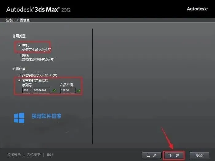 5.许可类型中选择“单机许可”选项。序列号中输入666-69696969或 667-98989898,产品密钥为128D1,点击下一步