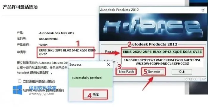 15.生成激活码:①使用快捷键“Ctrl+C”复制【申请号】后的代码;②使用快捷键“Ctrl+V”将代码粘贴到【Request】后的框中;③点击【Patch】;④点击【确定】;⑤点击【Generate】生成激活码。