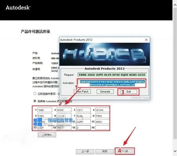 16.输入激活码:①使用快捷键“Ctrl+C”复制【Activation】后框中的激活码;②使用快捷键“Ctrl+V”将激活码粘贴到【激活码输入框】中;③点击【Quit】;④点击【下一步】