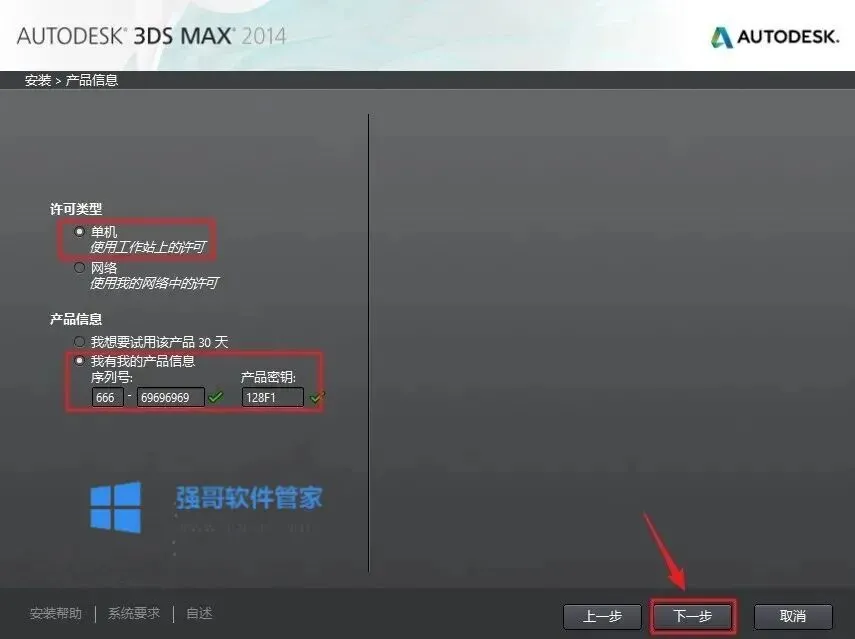5.许可类型中选择“单机许可”选项。序列号中输入666-69696969或 667-98989898,产品密钥为128F1,点击下一步