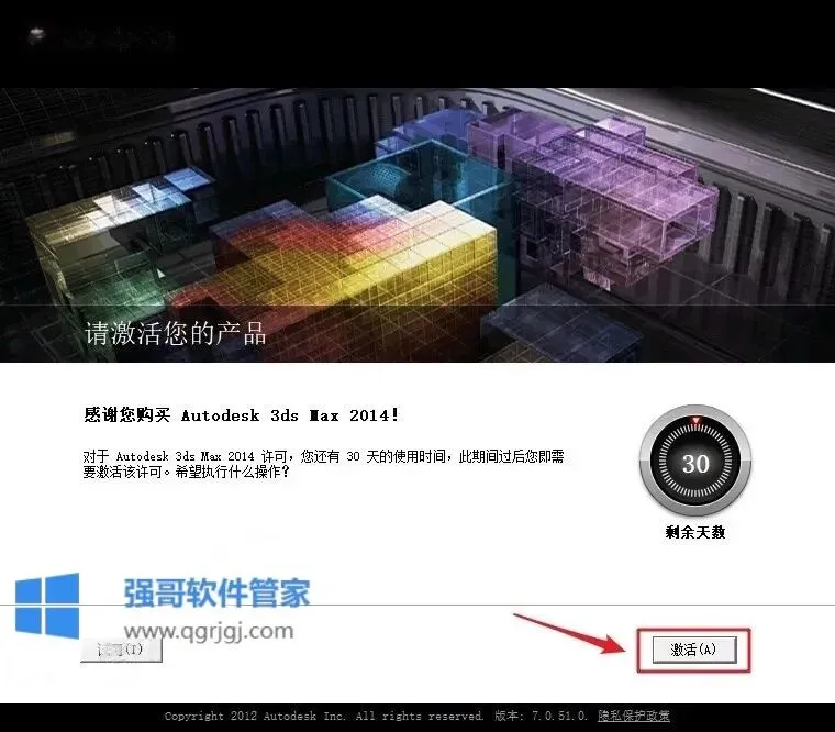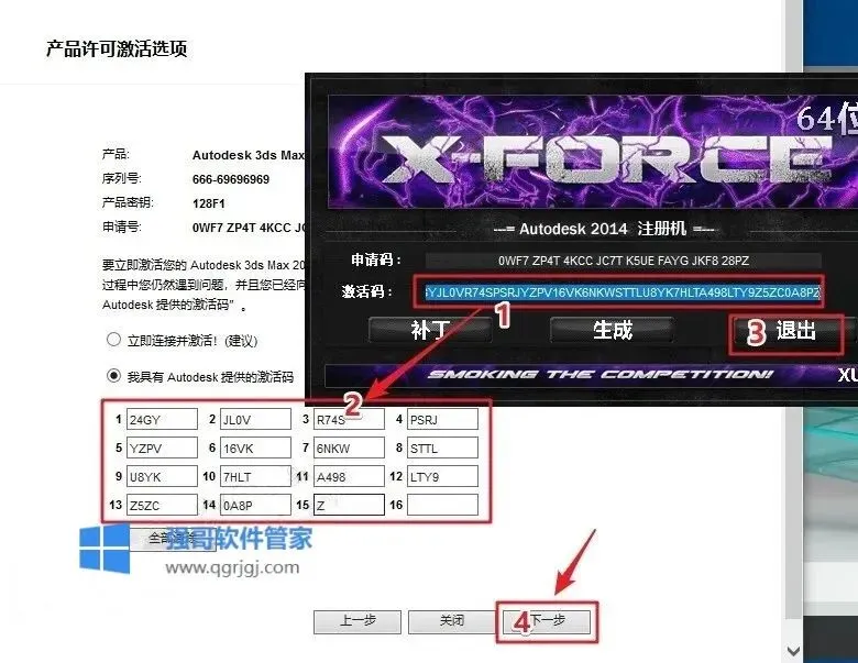 16.输入激活码:①使用快捷键“Ctrl+C”复制【Activation】后框中的激活码;②使用快捷键“Ctrl+V”将激活码粘贴到【激活码输入框】中;③点击【Quit】;④点击【下一步】