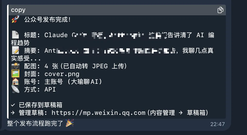 今晚这篇从 MD 到双号发布,整个流程跑下来大概 10 分钟。