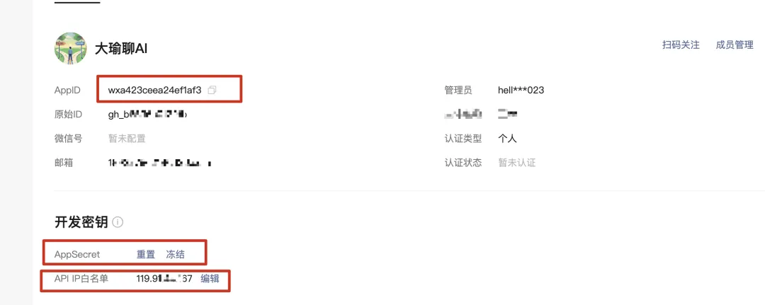 点击去,就会发现APPID,点击APPSecret方便的重置按钮,就回弹出一串密钥,这个密钥只会显示一次,一定要保存起来。
