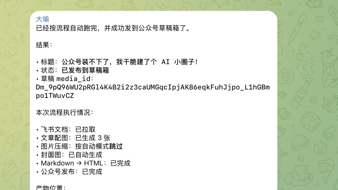 配合 wechat-publish-flow 做流程编排,基本实现了"丢一篇 MD 进来(或者飞书文档),出一篇公众号文章"的效果。