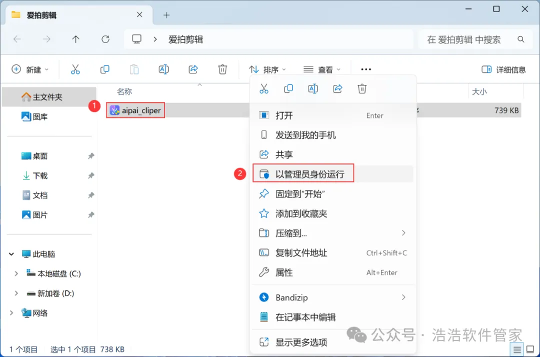 3、找到【爱拍剪辑】应用程序,右键选择【以管理员身份运行】它