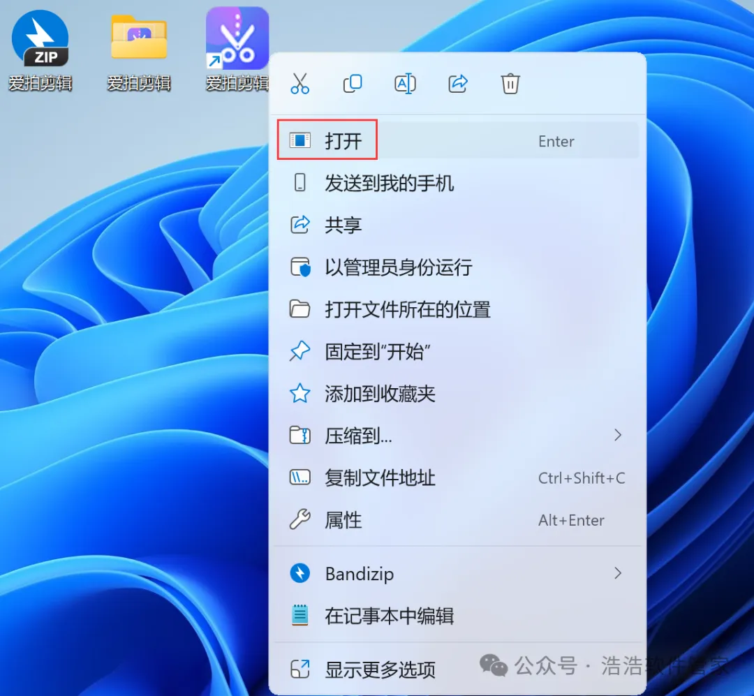 8、回到桌面,右键桌面上的【爱拍剪辑软件图标】,点击【打开】