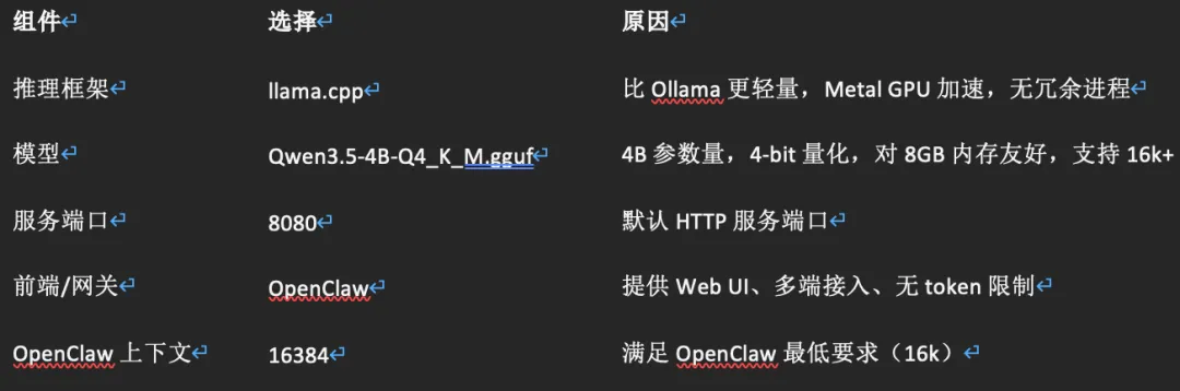 -m:模型文件路径 --host 127.0.0.1:仅本机访问(如需局域网改为 0.0.0.0) --port 8080:服务端口 -ngl 99:将模型全部加载到 GPU(M2 Metal) --ctx-size 16384:上下文窗口大小(必须 ≥16000 以满足 OpenClaw 要求)