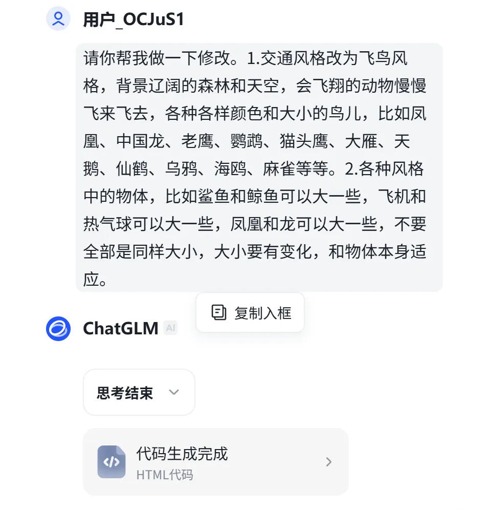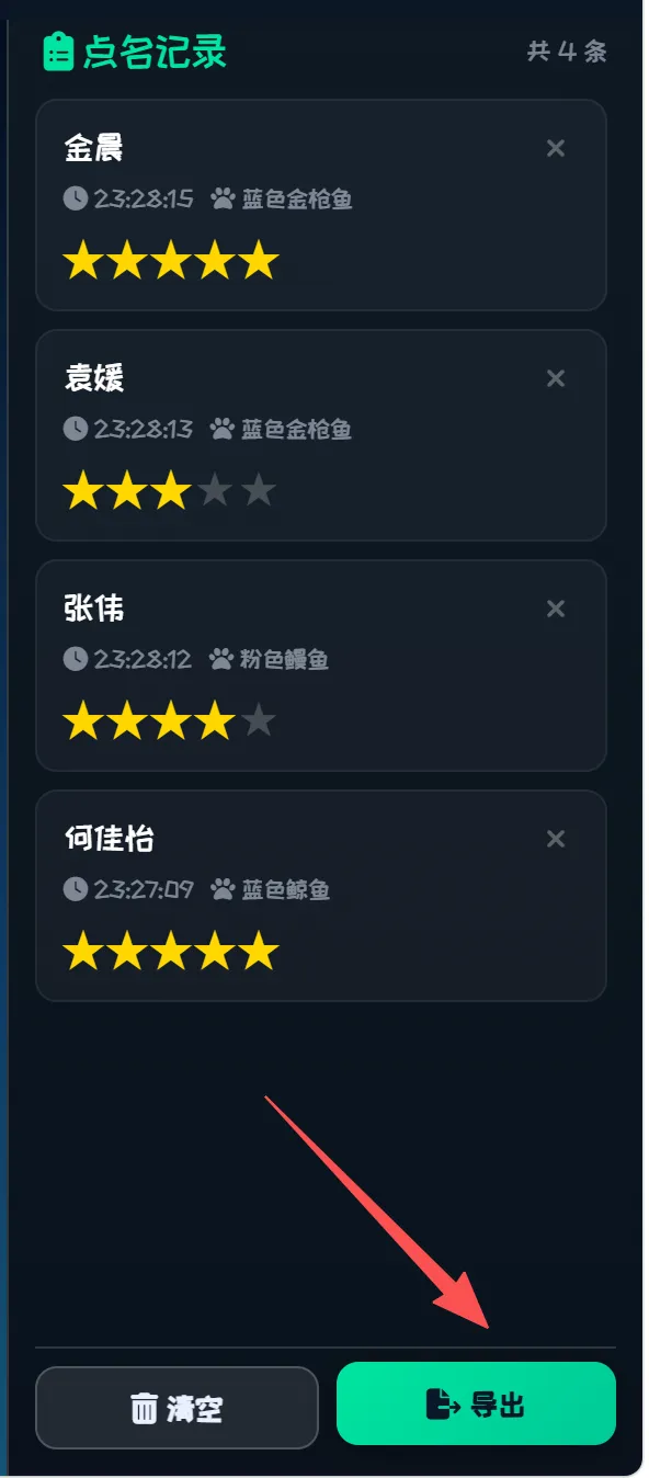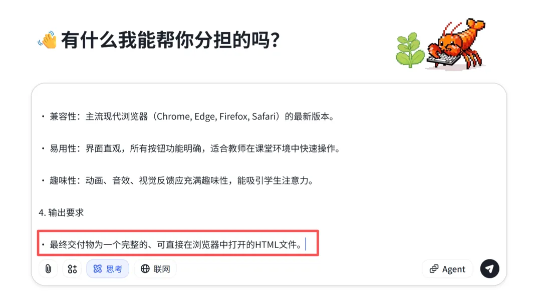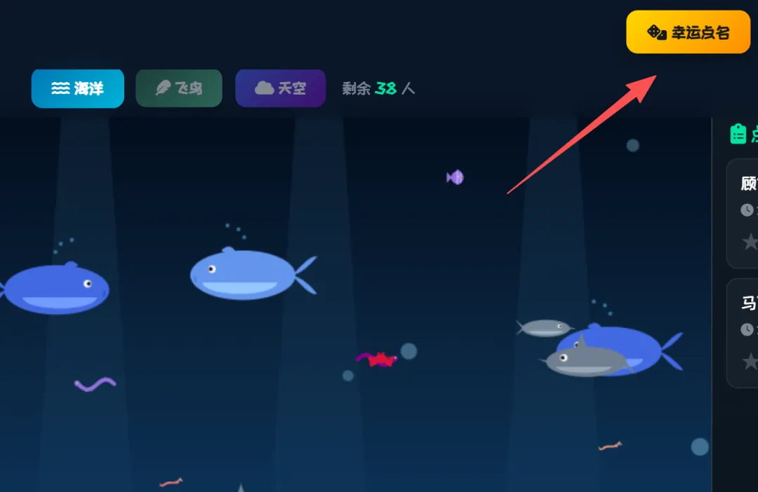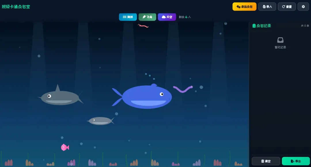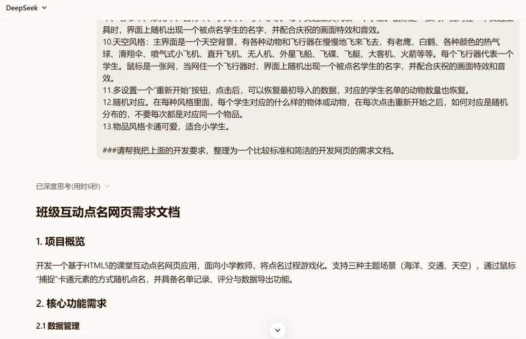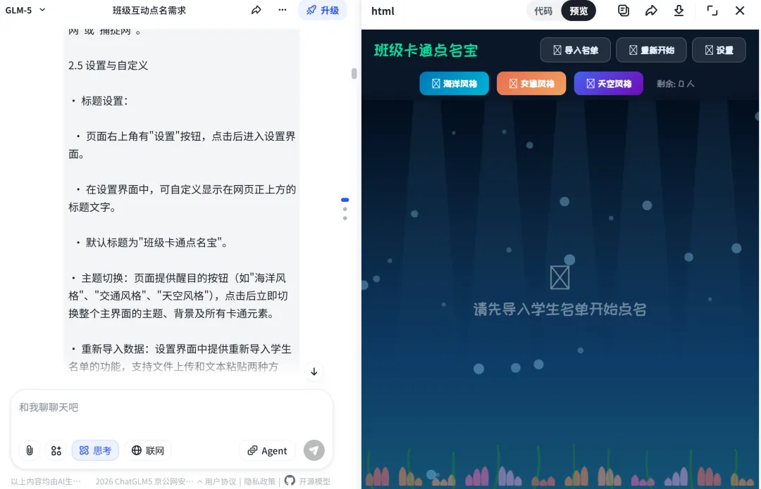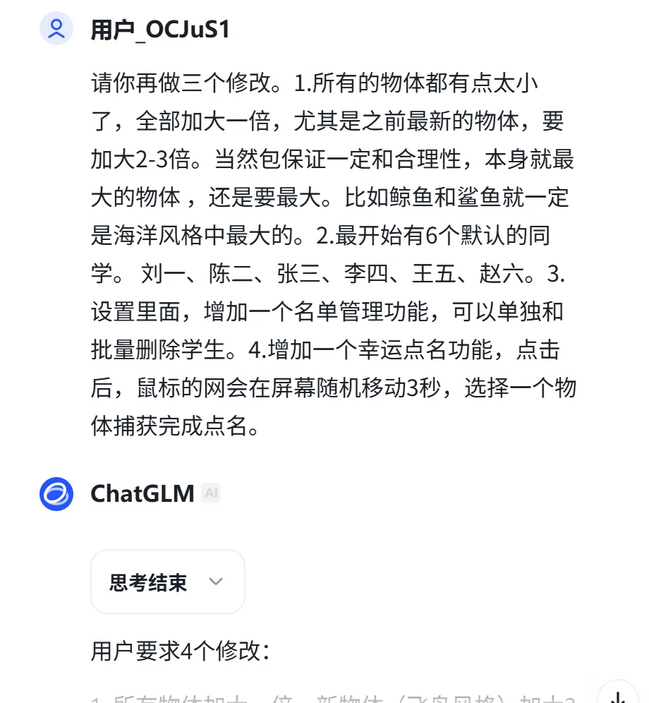 AI很快帮忙整理好了规范整齐的需求。这部分内容检查没有问题后,就可以请出我们的AI变成工具了。免费,免登录可以使用,而且生成效果非常好。我都不记得是第几次在文章中推荐智谱了,都想找智谱要广告费了。“输出要求:最终交付物为一个完整的、可直接在浏览器中打开的HTML文件。” 记得最后这句话很重要,一个html文件,方便我们后期直接下载就可用。第一次的内容还是有些小问题,比如没有默认的学生,交通风格直接拉了,背景的房子在乱跑,有些物体显得太小了……但是这都没有关系,直接和AI对话,继续修改就好了,我继续对话,不断修改,修复bug,增加幸运点名等新功能。下面给大家介绍一下这个“班级卡通点名宝”的主要三大功能。导入学生名单(导入方法见后面)后,学生们就变成鱼儿在网页上快乐地游动,画面很美,重点是——大家不知道哪条鱼儿是哪个学生。当鼠标的网点中一个鱼儿后,幸运学生的名字就会出现了。为了增加趣味性,还有一个“幸运点名”按钮,是随机上的随机,会由电脑在3秒内,自动捕捉一条鱼儿!点名之后,教师可以根据学生的表现进行打分,并且这个打分记录还可以导出为excel表,作为后续评价的依据留存。点击名记录下面的“清空”,或者上方的“重置”按钮,可以重新开始点名。为了满足不同的审美和场景,可以有三套风格可以切换,除了海洋风格,还有飞鸟和天空风格。点击网页中间的风格按钮,可以随时切换,就算在点名中间页可以自由切换。打开网页后,大家可以点击右上角的“设置”按钮,修改网页的名称。在“设置”中,可以直接复制学生的名字,单列粘贴后导入,也可以用excel文件导入,非常方便。施老师最近在线下给一线教师进行AI实操培训,有老师在看到AI帮自己写代码的时候,觉得非常神奇,在看到作品后非常惊喜,感觉“自己强得可怕”!是啊,普普通通的文科老师,可能一辈子都不会想到自己竟然会用AI来编写代码,这属于彻底破圈了,难怪会发出感慨。AI是能力放大器,AI更是你跳出舒适圈,扩展能力和破圈的利器。施老师希望我的读者朋友们,除了直接下载文件去使用,更要鼓起勇气去自己尝试。如果你觉得施老师做得不够好,没有满足你的需求,那是非常好的想法!如果你有了更棒的主意,不要只给我留言来提需求,何不自己去试试?https://pan.quark.cn/s/cb8e3d0cafa1