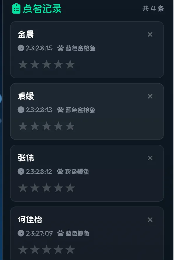 班级卡通点名小程序(下载即用)施老师最近分享的“班级开心农场”积分系统,很受老师们欢迎,很多人点赞支持,施老师在这里一并谢过。但是我最想看到的,还是老师们动手去尝试,把AI工具化为己用,能更灵活的为自己的教学工作提供助力。因为很多东西是一窍通百窍,只要做好了一次,后面就可以不断开始创新。施老师在做“班级开心农场”积分系统之前,还做了另外一个小网页程序,一样是大家日常高频使用的场景,今天也分享给大家——“班级卡通点名宝”!施老师一直有个想法,希望做一个可爱好玩的班级点名网页。为什么?因为有很多学生在老师点名的时候,会本能惧怕和紧张,影响状态,如果这个过程好玩一点,是不是学生也会更放松一些?我之前做过尝试,实现功能是很容易的,但是界面不够吸引人,我之前在办公室养过金鱼和热带鱼,觉得鱼儿在水里游动的画面很漂亮,那要不要把班级变成海洋,把学生变成海里的鱼?捞鱼=点名!一定很好玩!我先用智谱试做了一下,哇,还不错哟!值得认真做一次!于是我开始把试做的要求整理了一下,一起放到一大堆的提示词里面,让AI帮忙生成需求文档。这里的AI用常见的大模型都可以。请帮我设计一个班级点名小程序,以html网页格式输出。具体要求如下: 1.学生名单可以通过excel表格导入。2.主界面是一个海底珊瑚礁,有各种海洋生物慢慢地游动,不要出现乌龟和海龟这样的动物。可以多一些其他的海洋生物,鲨鱼,鲸鱼,鳗鱼,金枪鱼热带鱼、虾、螃蟹等在游来游去,有大有小,有不同的颜色。每个动物代表一个游过去的学生。3.鼠标是一张网,当网住一个小动物时,界面上随机出现一个被点名学生的名字,并配合庆祝的画面特效和音效。4.被点名的学生名单,保留在侧边的点名记录中。教师可以对这个名单中的人员进行五星评分。5.点名记录和评分可以被删除和下载保存为excel格式。6.画面整体风格活泼可爱,受学生喜爱。 7.请在网页右侧增加一个设置按钮。进入设置界面后,可以设置网页的标题,标题显示在网页正上方。默认显示为“班级卡通点名宝”。 8.请再增加一个切换风格的按钮。除了海洋风格,还有森林风格和天空风格。点击切换后,可以更换不同的主界面风格。 9.交通风格:主界面背景是一个宽阔的街道,有各种交通工具在慢慢地移动,有各种形状和颜色的小汽车、公共汽车、老爷车、摩托车、自行车、小火车、马车等等。每个交通工具代表一个学生。鼠标是一张网,当网住一个交通工具时,界面上随机出现一个被点名学生的名字,并配合庆祝的画面特效和音效。 10.天空风格:主界面是一个天空背景,有各种动物和飞行器在慢慢地飞来飞去,有老鹰、白鹤、各种颜色的热气球、滑翔伞、喷气式小飞机、直升飞机、无人机、外星飞船、飞碟、飞艇、大客机、火箭等等。每个飞行器代表一个学生。鼠标是一张网,当网住一个飞行器时,界面上随机出现一个被点名学生的名字,并配合庆祝的画面特效和音效。 11.多设置一个“重新开始”按钮,点击后,可以恢复最初导入的数据,对应的学生名单的动物数量也恢复。 12.随机对应。在每种风格里面,每个学生对应的什么样的物体或动物,在每次点击重新开始之后,如何对应是随机分布的,不要每次都是对应同一个物品。 13.物品风格卡通可爱,适合小学生。 ###请帮我把上面的开发要求,整理为一个比较标准和简洁的开发网页的需求文档。 |