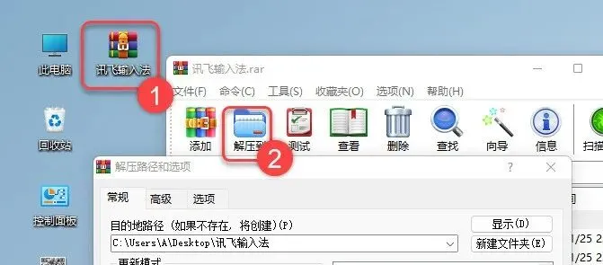 1.解压安装包:①双击【讯飞输入法】压缩包②点击【解压到】③点击【确定】。