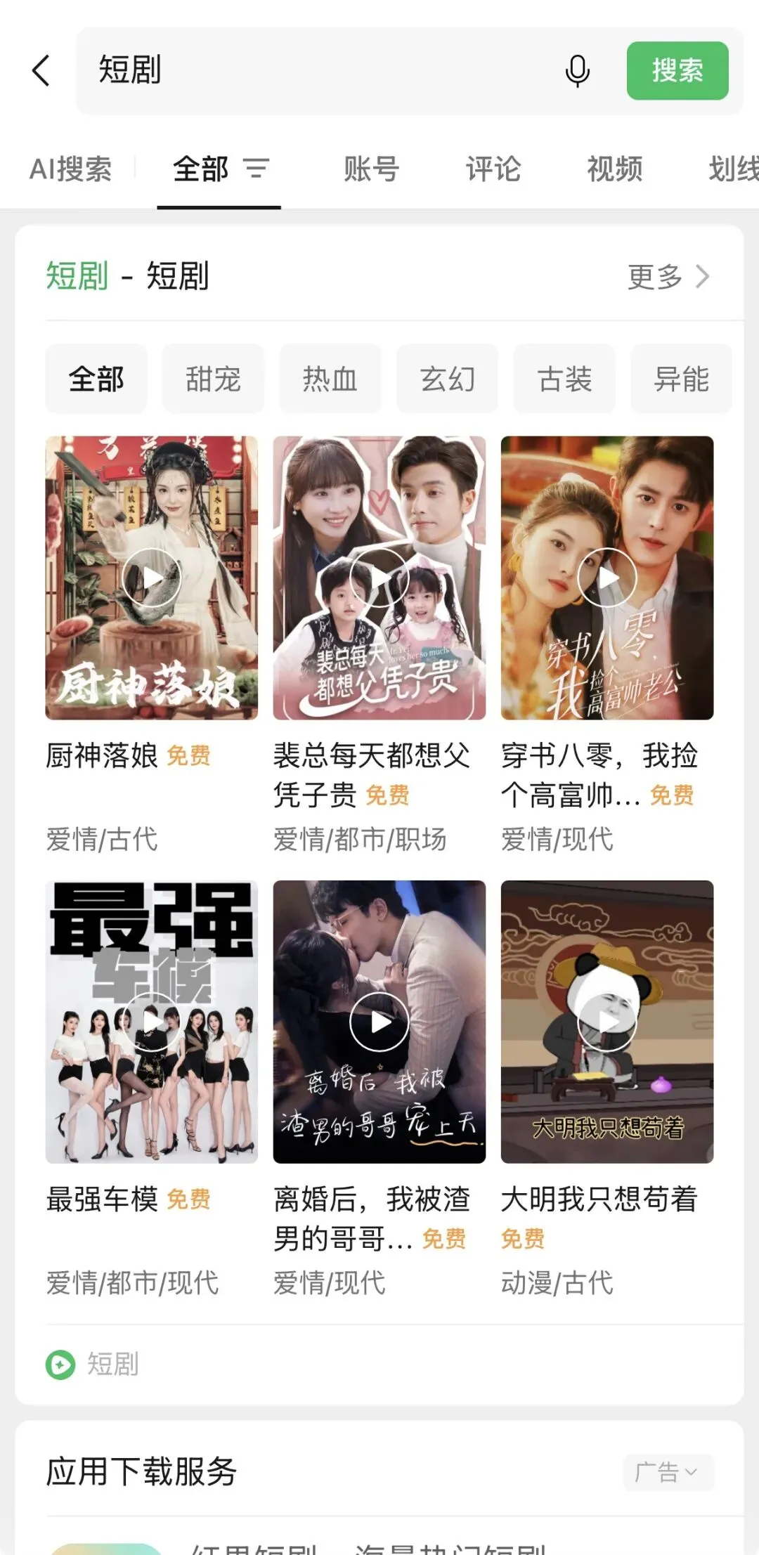 打开微信,在顶部的"搜索框"里输入"短剧",然后点击搜索。就会出现如下图界面