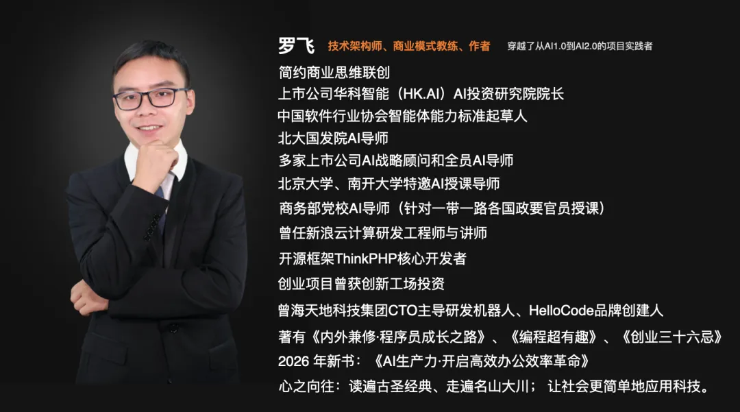 罗飞是一位从 AI1.0 到 AI2.0 的项目实践者,多家上市公司AI战略顾问以及全员AI导师。从2016年研发AI机器人项目被央视报道并科技部评委国内技术先进,2020年转型商学院导师,辅导上百家企业的商业模式与AI转型。2024年打造了“全员AI”体系化赋能企业的培训产品,两年间助力多家企业形成AI战略,落地AI场景。服务公司如天士力集团、京东方、国富量子(00290.HK)、中粮集团、亦庄控股、江苏科瑞恩、安然集团、保罗集团、东兴鼎昊、中能北方等企业, 涉及行业有: 金融、地产、大健康、产业园、区块链、教育、餐饮、白酒、生物医药、猎头、人力资源、快消品、物流等行业