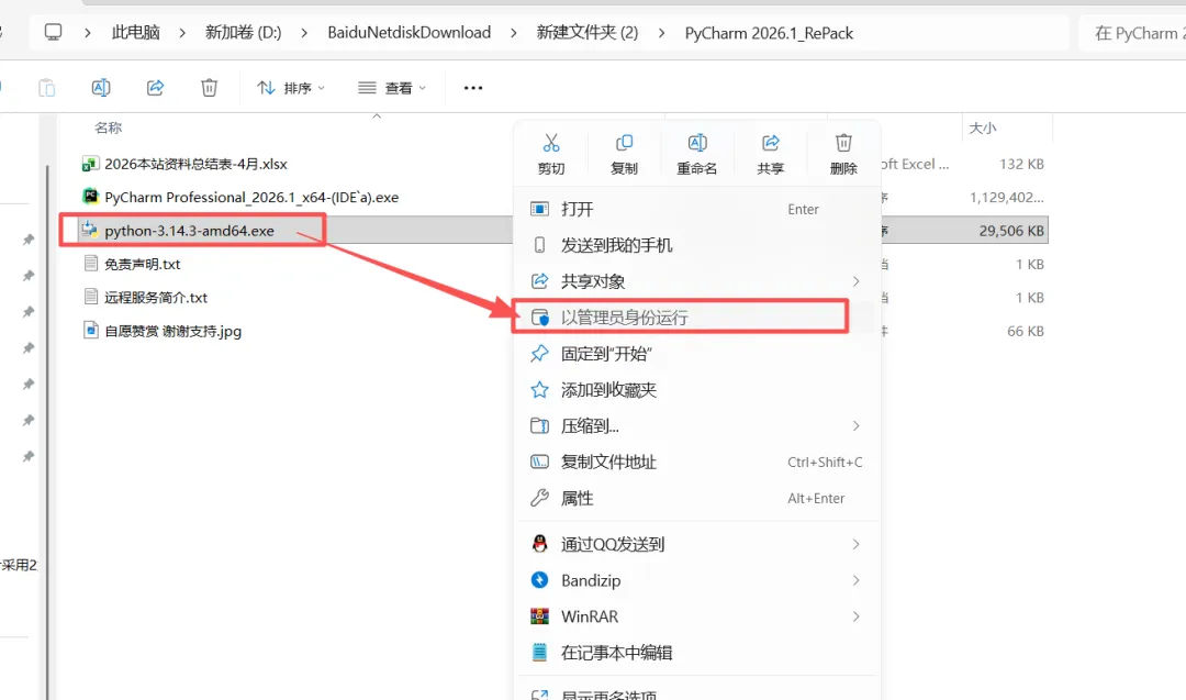 8、以管理员身份运行【PyCharm Professional_2026.1_x64-(IDE`a)】。