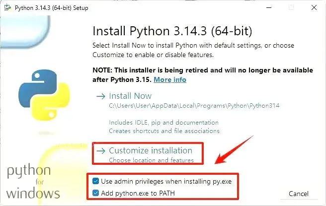 3、勾选【Add Python...】和【Use admin privileges....】,点【Customize installation】。