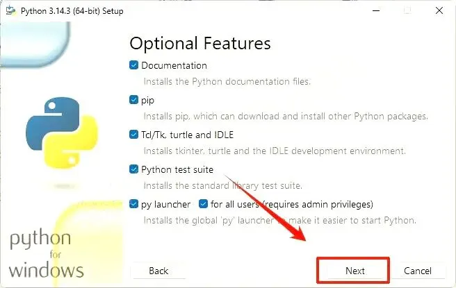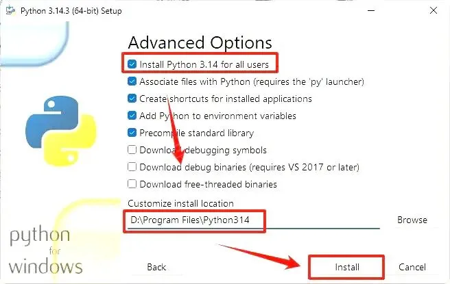 5、勾选【Install Python 3.14 for all users】,安装位置选择在D盘, 点【Install】。