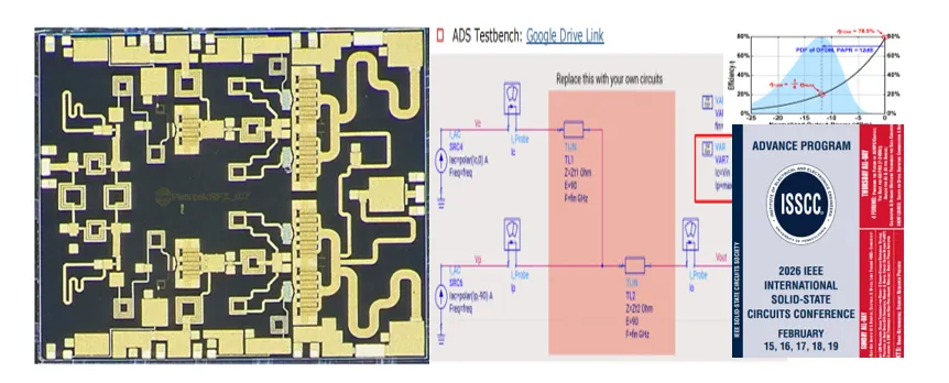 一个典型的创新是利用 Rat-Race 耦合器替代笨重的变压器。更前沿的设计则采用了 扩展型 Rat-Race 耦合器(Extended Rat-Race Coupler):它巧妙地将并行 Doherty 的负载调制逻辑与串行功率合成(Series Power Combining)结合在一起,原生支持差分信号。这种在分布式结构上的“微雕艺术”,让 Doherty 架构在 38GHz 甚至更高频段依然能爆发出惊人的生命力(除了王华教授这样的业界顶流,国内做的比较好的大家可以看看清华陈文华、王燕;东南陈继新、洪伟;电子科大康凯、王政等教授团队的毫米波功放研究动态)。