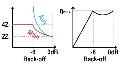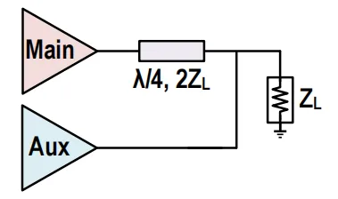 传统放大器在功率回退时,漏极电压摆幅会随之减小,导致效率线性下降。为了在电流减小时依然维持最大电压摆幅(Doherty 引入了辅助放大器(Aux)来动态改变主放大器(Main)看到的“视觉阻抗”: