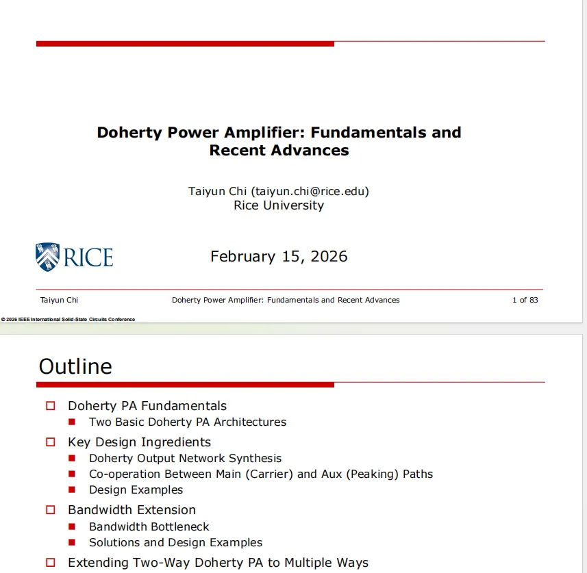 从 W.H. Doherty 在 1936 年那间充满真空管的实验室,到 2026 年 ISSCC 讲台上讨论的硅基 CMOS 数字化芯片,Doherty 架构跨越了近一个世纪的技术周期。它不仅仅是一个电路拓扑,更是一种平衡功率、效率与线性的哲学。本文重点基于ISSCC2026发表的《T10 - Doherty Power Amplifier Fundamentals and Recent Advances》进行解析【文末提供原文下载方式,建议感兴趣的读者,可把论文原文下载下来,仔细研读,引用】