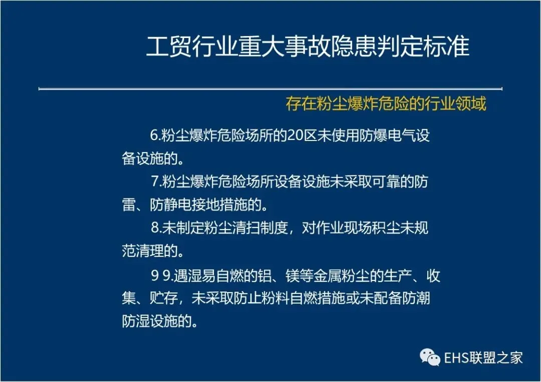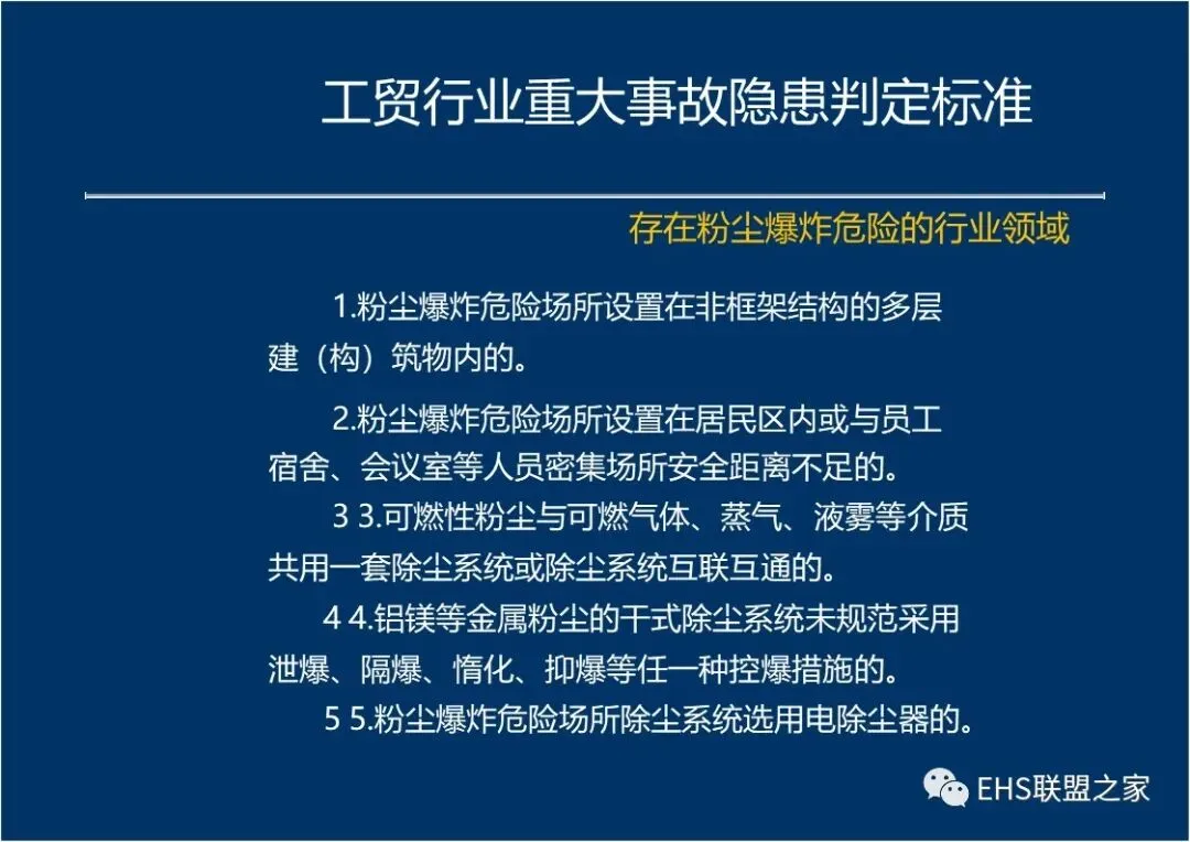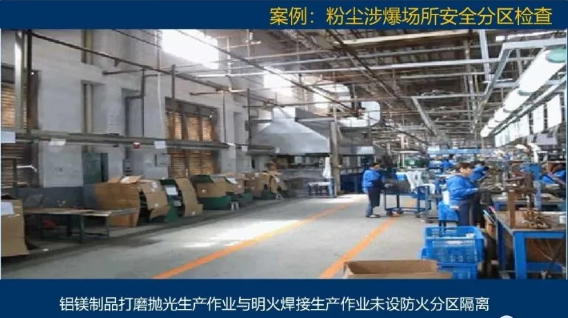 粉尘爆炸危险场所设置在非框架结构的多层建(构)筑物内。 粉尘爆炸危险场所设置在居民区内,或与员工宿舍、会议室等人员密集场所、以及危险化学品仓库的安全距离不足。 粉尘爆炸危险场区与其它加工方式的作业区未按规范隔离。粉尘爆炸环境危险区域采用产生明火、高温和释放可燃气体等存在产生粉尘爆炸危险的生产作业方式及工艺。 未按规范设置安全通道和安全出口,安全通道不畅通,堆放易燃易爆物品物品。 集中通风、采暖和空调管线在管线进入粉尘爆炸环境危险区域之前未设置防火阀,通风系统的风机、空调系统的制冷 (热)装置设置在粉尘爆炸环境危险区域。 未按规范设置防雷、以及防静电接地设施。