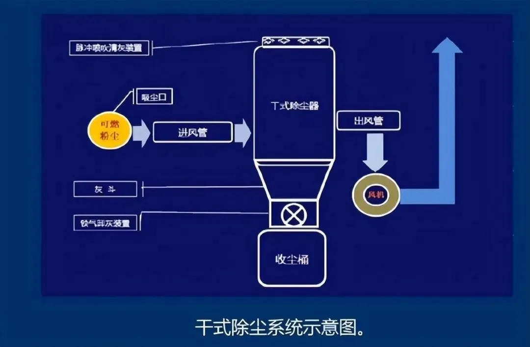 不同种类的可燃性粉尘合用同一除尘系统,除尘系统与带有可燃气体、高温气体、烟尘或其它工业气体的风管及设备连通。