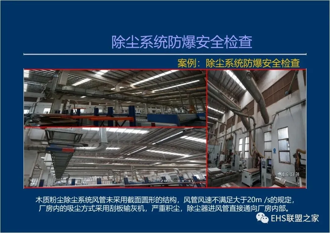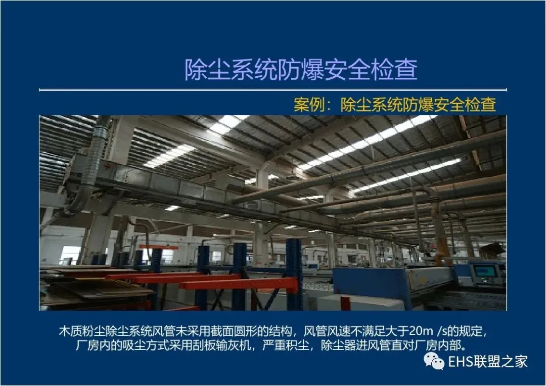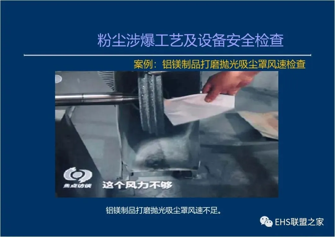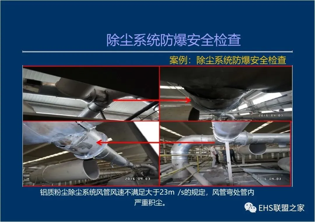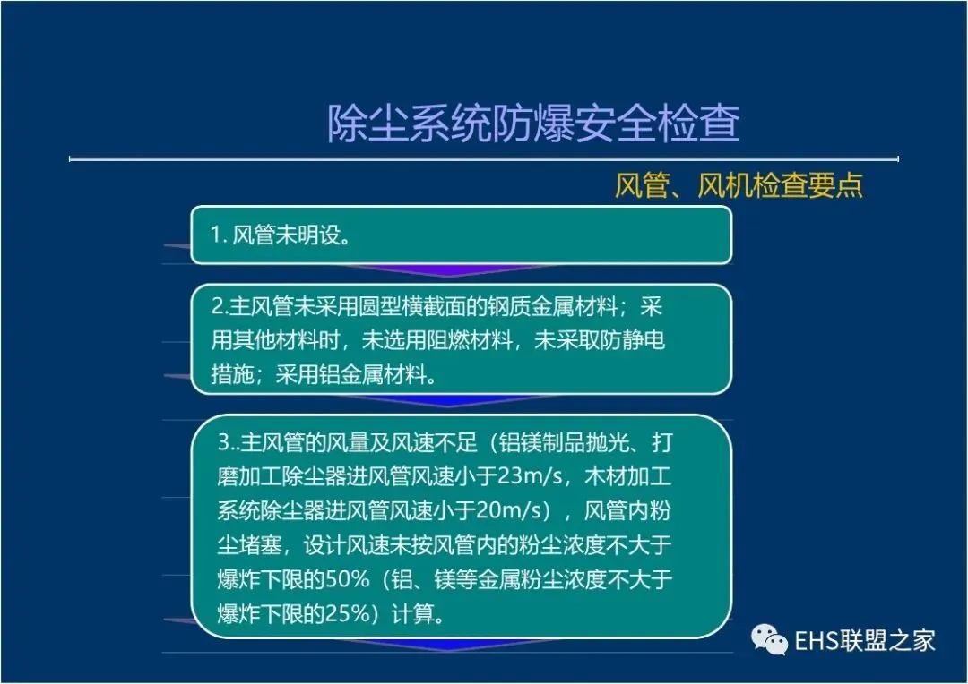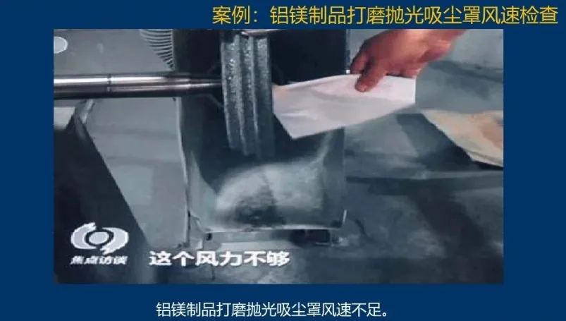 主风管的风量及风速不足(铝镁制品抛光、打磨加工除尘器进风管风速小于23m/s,木材加工系统除尘器进风管风速小于20m/s) ,风管内粉尘堵塞,设计风速未按风管内的粉尘浓度不大于爆炸下限的50% (铝、镁等金属粉尘浓度不大于爆炸下限的25%)计算。