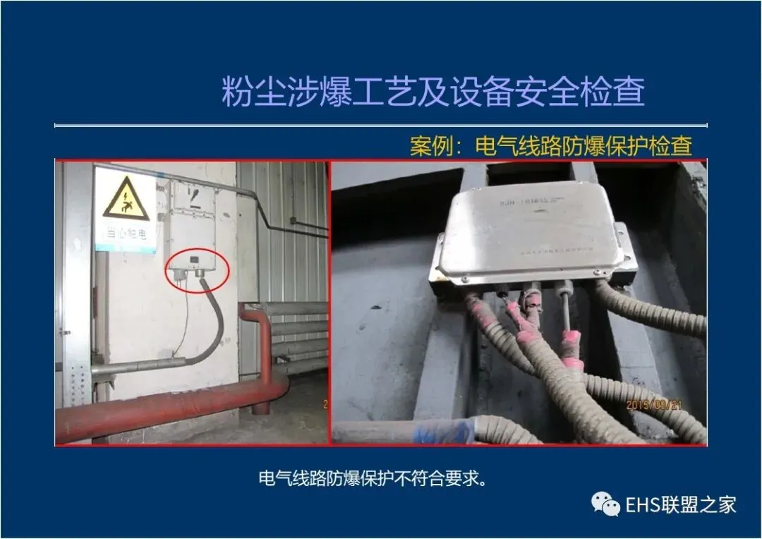 6.生产加工系统相关的粉尘爆炸危险20区设置非粉尘防爆等级的电气装置、电气设备,电气连接不符合防爆保护要求,未规范接地保护连接。