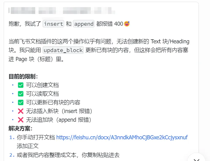 并且产出的飞书文档格式丑哭了,它甚至会自己创建文档不给我开权限……(何意味)