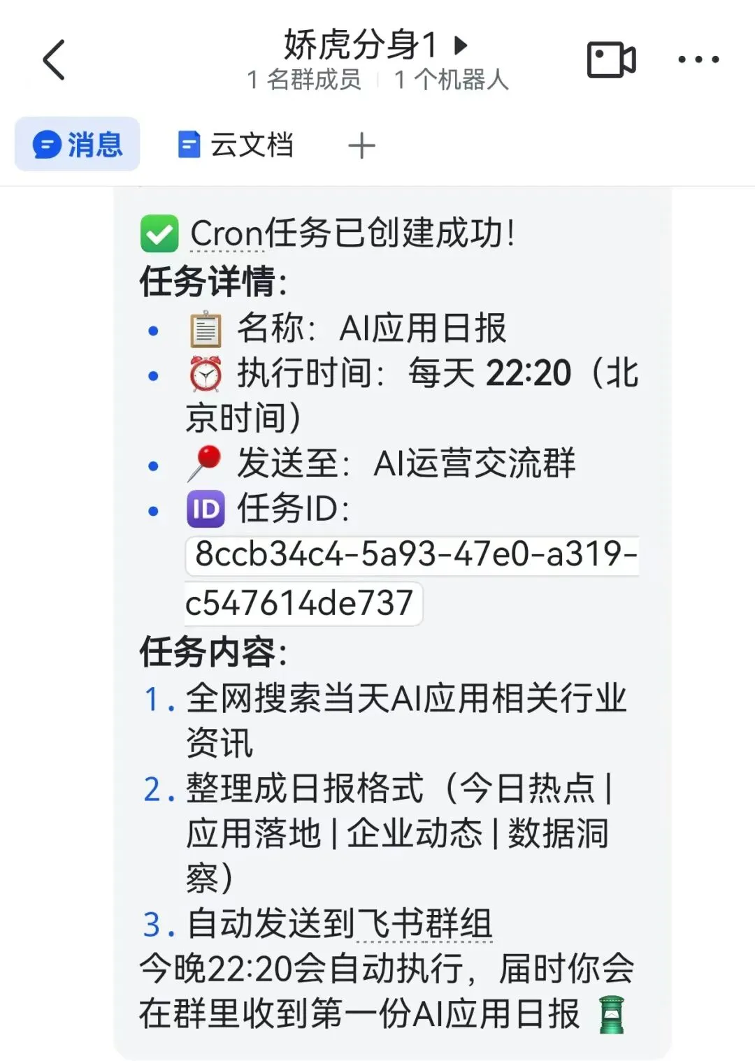 ✅ 解决:按 “时间 + 做什么 + 格式 + 推送给谁” 说清楚,看到 “创建成功” 即可。