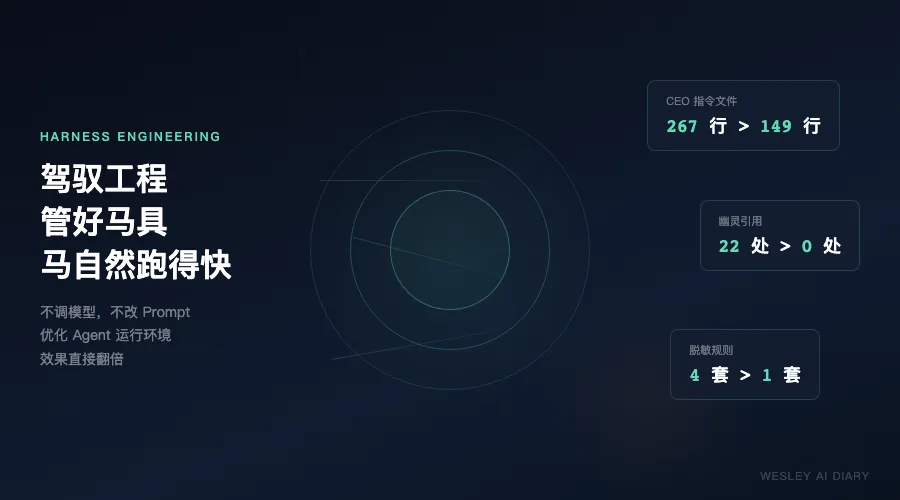 读完这篇文章,你会知道三件事:第一,2026 年 AI 工程的真正战场已经从"怎么写 Prompt"转移到"怎么工程化管理 Agent 的运行环境";第二,这个方向有一个正式名字叫 Harness Engineering,由 HashiCorp 联合创始人 Mitchell Hashimoto 在 2026 年 2 月命名;第三,我用 OpenClaw 的 Agent 团队亲身验证了这条路——配置文件从 267 行优化到 149 行,底层模型一个参数没换,Agent 的效果却显著提升。